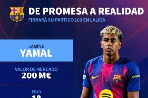 18岁亚马尔有望今晚达成西甲100场里程碑,此前99场28球32助