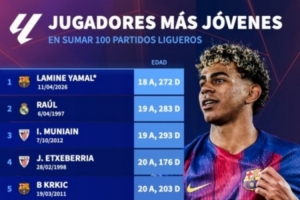 西甲出战100场最年轻球员榜:亚马尔居首,劳尔、穆尼亚因前三